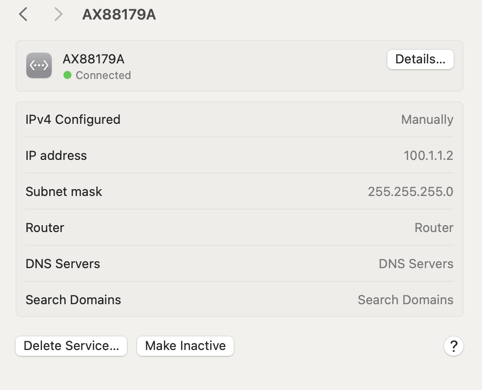 Now go into System Settings → Network choose the ethernet device, and make sure the settings match these: